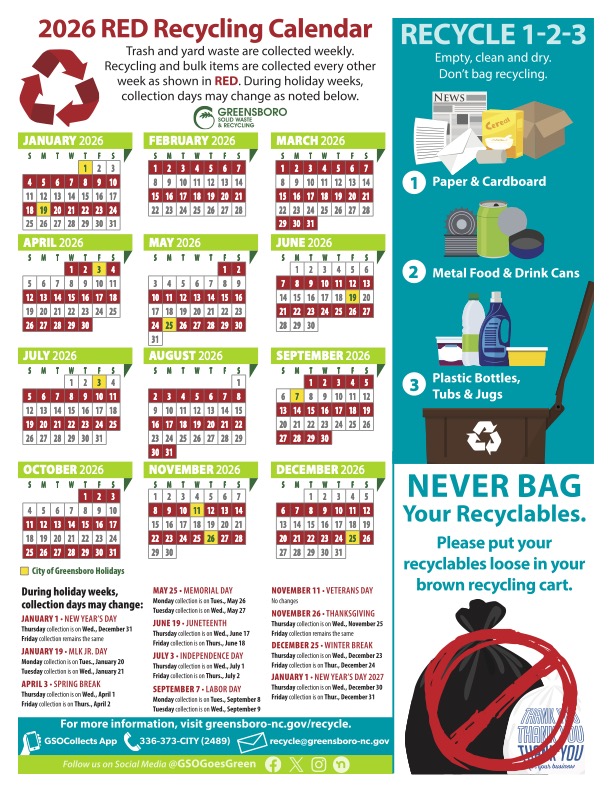 Garbage and yard waste are collected every Friday. Recycling and bulk trash collections are made every other Friday. Click here for details.