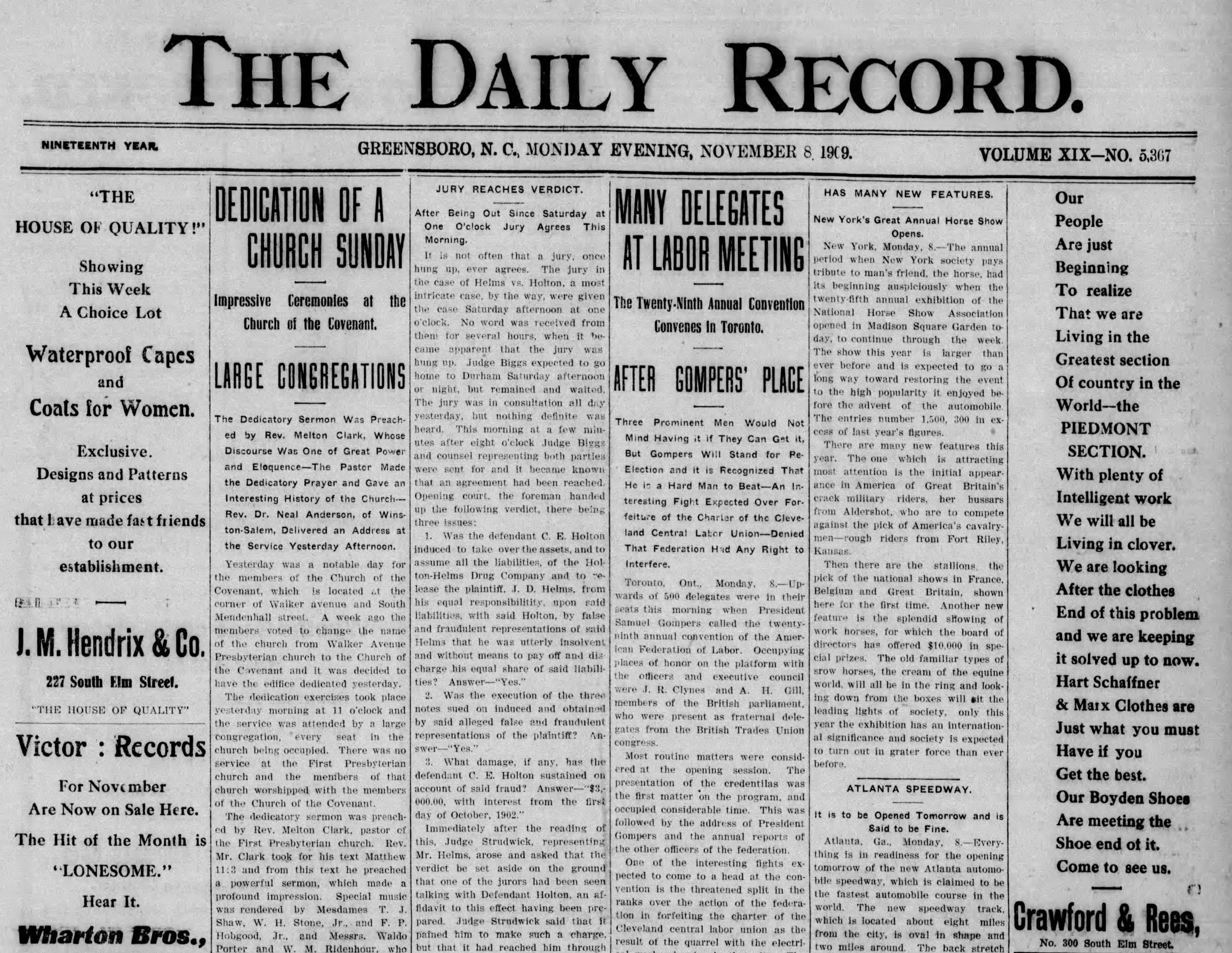The Walker Avenue Presbyterian Church was organized in 1908 with 83 members. Its original building was dedicated in 1909 at 501 S. Mendenhall. The name was changed then to the Church of the Covenant. The minister of music at the time was a neighbor living at 212 S. Mendenhall, Professor Charles J. Brockmann of the State Normal and Industrial School for Women, now UNC Greensboro.